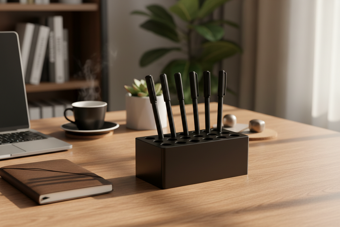 Keep your desk neat with the Workzen™ FlexiPen Desk Organizer. Made from matte-black aluminum, it holds multiple pens, pencils, and small stationery items upright....