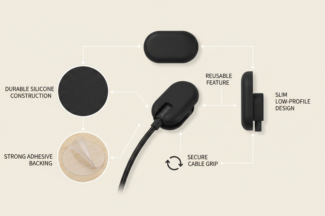 The adhesive base sticks securely to the desk or side of a monitor, preventing cable tangles and keeping workspaces clean.